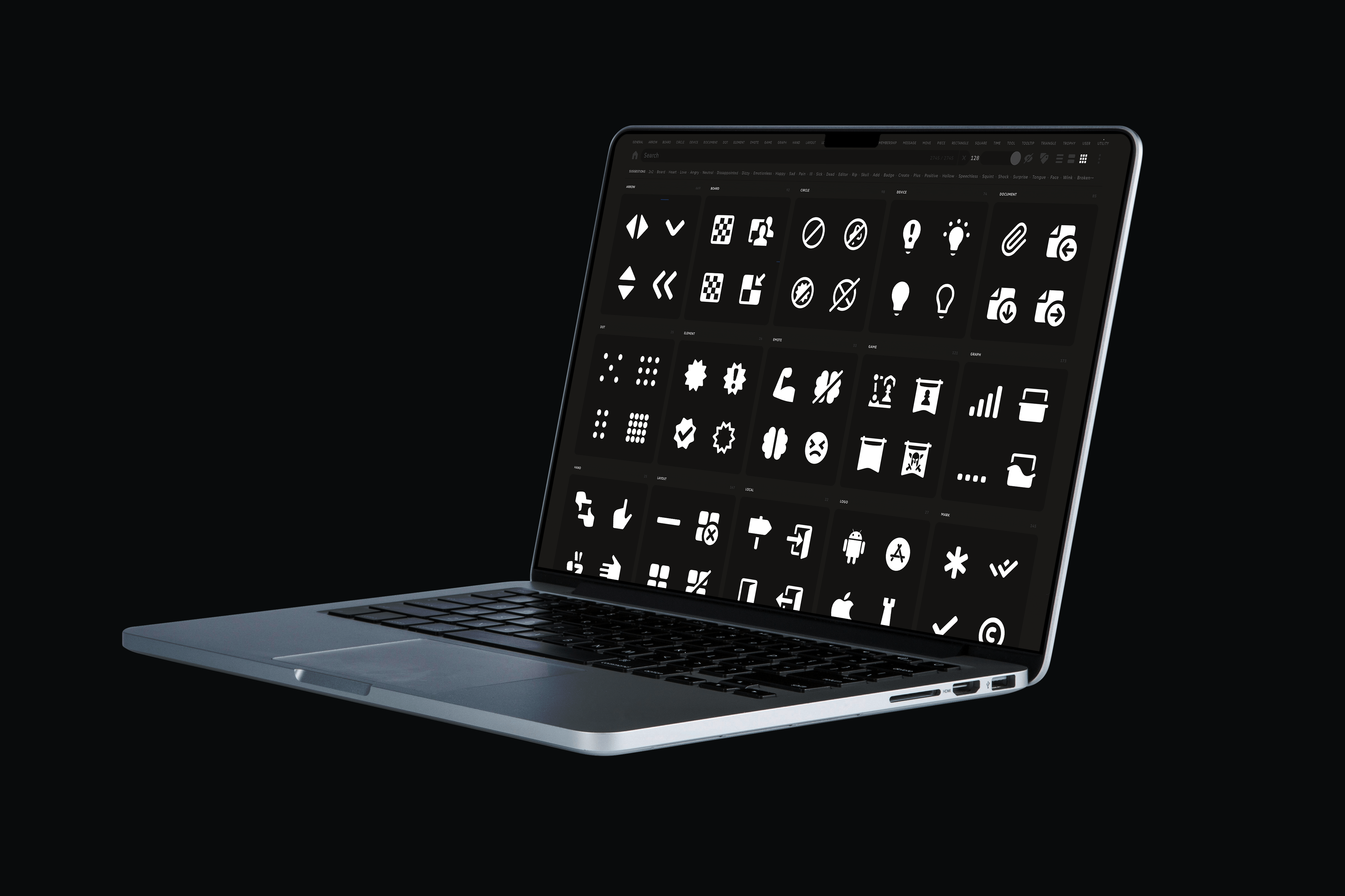 The other system — While color icons handle features and marketing, a parallel set of 2,700+ monochrome glyphs powers the UI. 47 categories, negative and hollow variants, optical size variants for arrows and marks. Built on a 12-unit grid, 24×24 default with overshoots. Same design challenge: making abstract chess concepts—tactics, openings, time controls, engine analysis—scannable and a joy to look at.