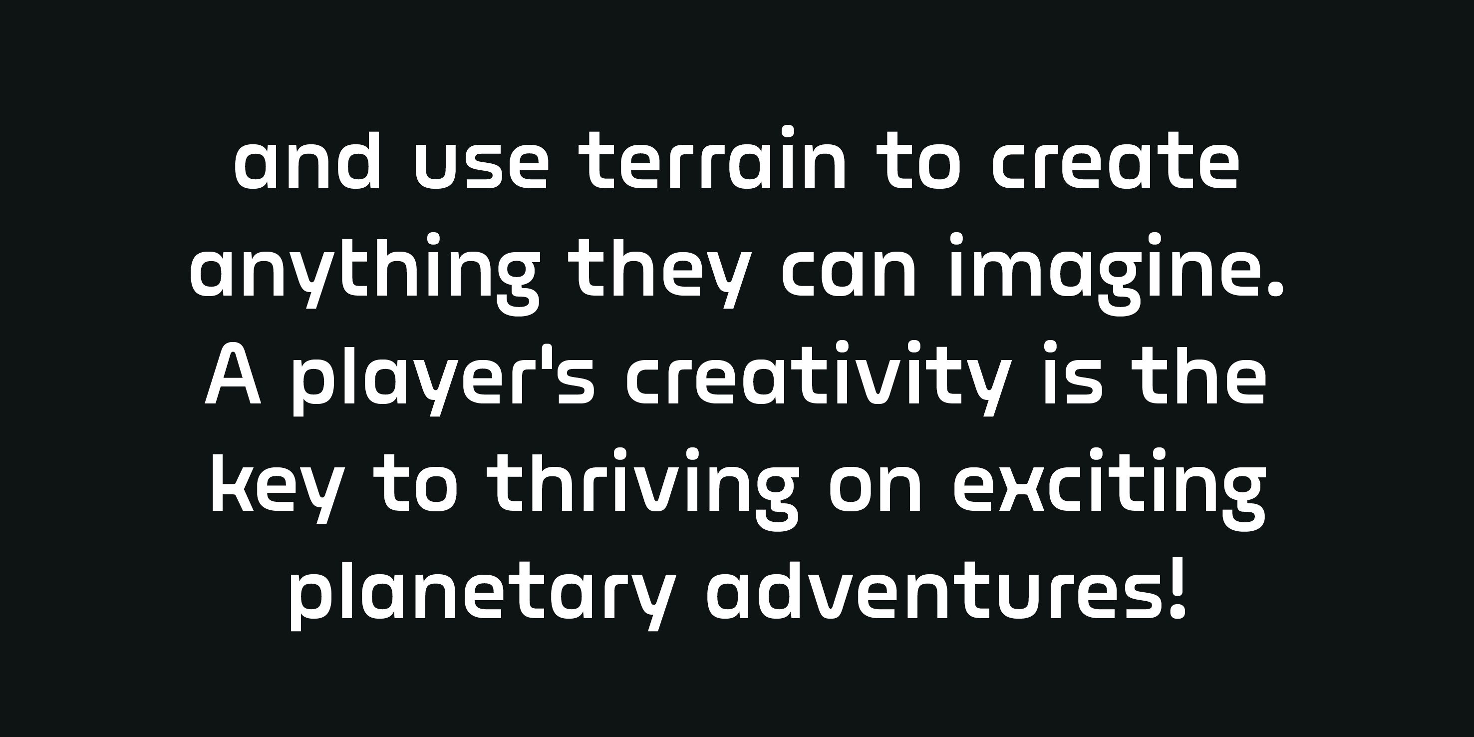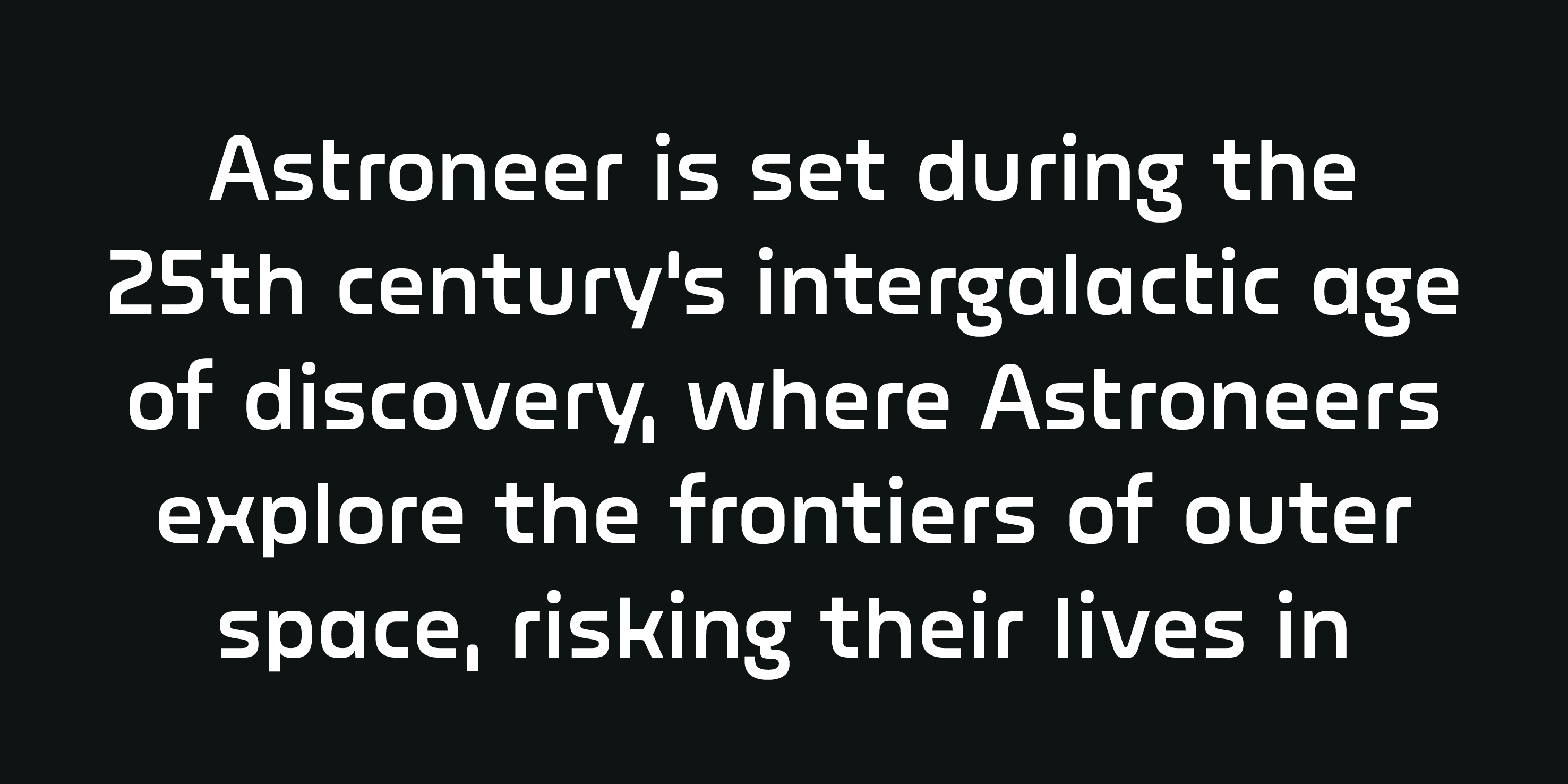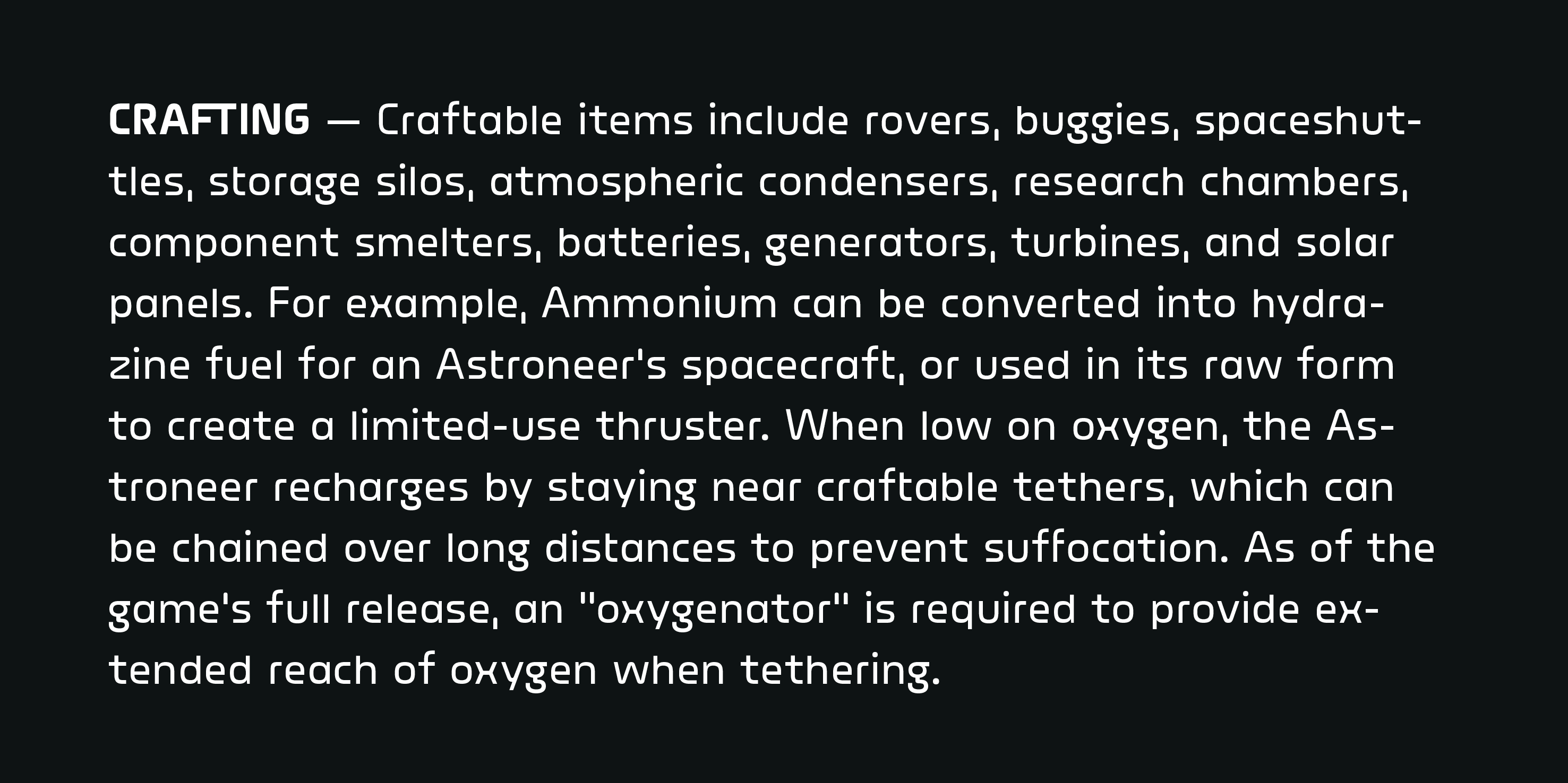 For Astroneer, a sandbox adventure game developed from independent developer System Era Softworks, released in early access December 2016. The player is tasked with colonizing planets, creating structures, and collecting resources.