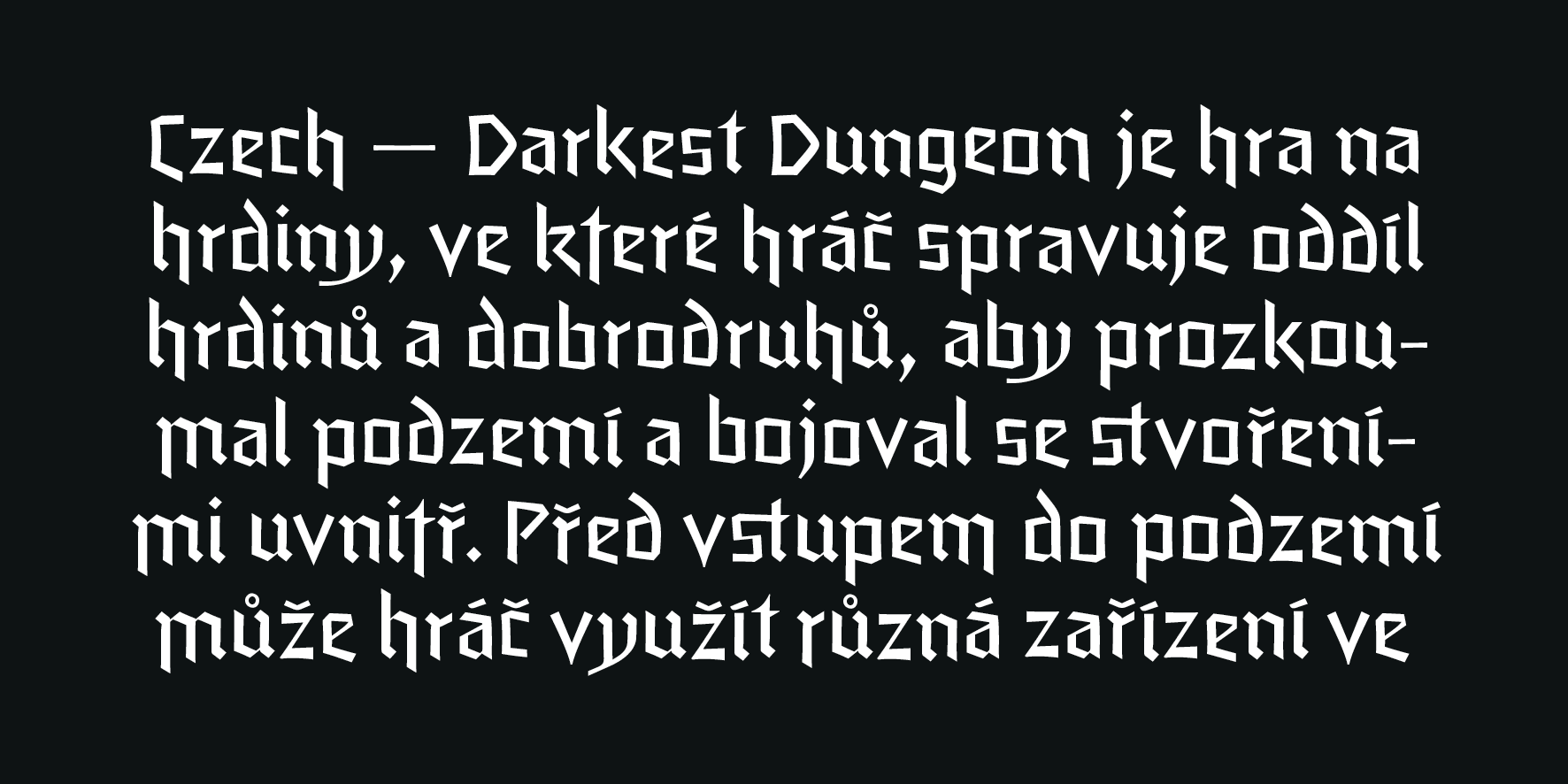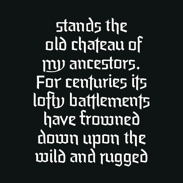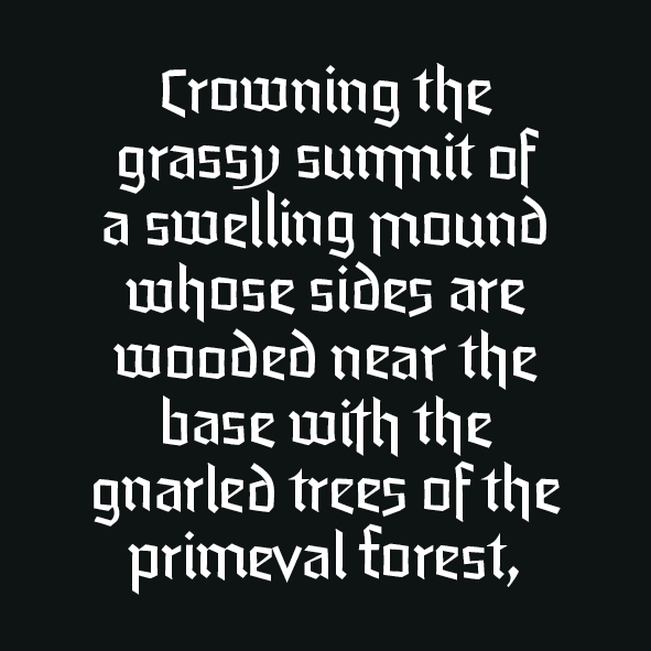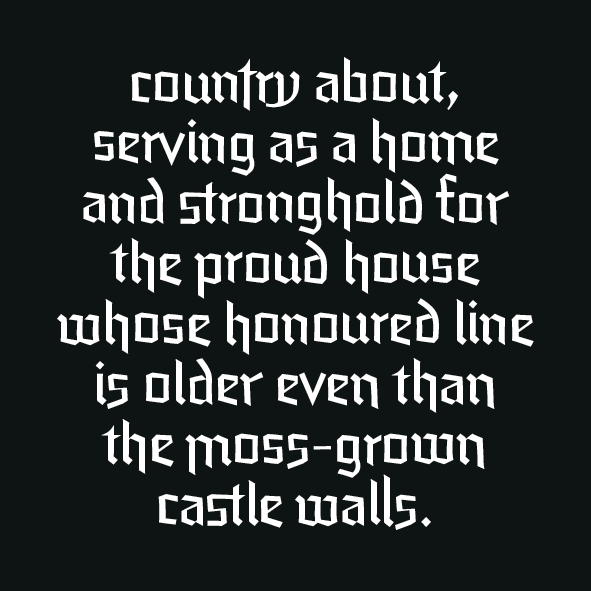 A unique feature of this typeface is the stylistic axis from plain to flourishing initials. Depending on the length of the text there is an appropriate choice. For example a long format text should be relatively plain and simple, while titles should have some flourish to draw attention. Location or character names can even be wider and more ornate.